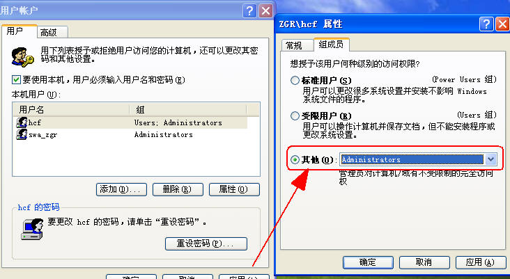 ②在“开始”→“运行”→输入“control.exe userpasswords2”进入“用户帐户”并选择赋于他Administrator系统管理员的权限参见下图红框中所示:→