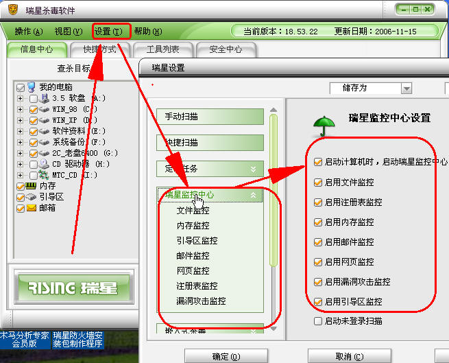 请检查一下系统服务中的瑞星服务项目都设置为自动了吗?再者在瑞星内存监控中心设置一下,参见下图红框中所示