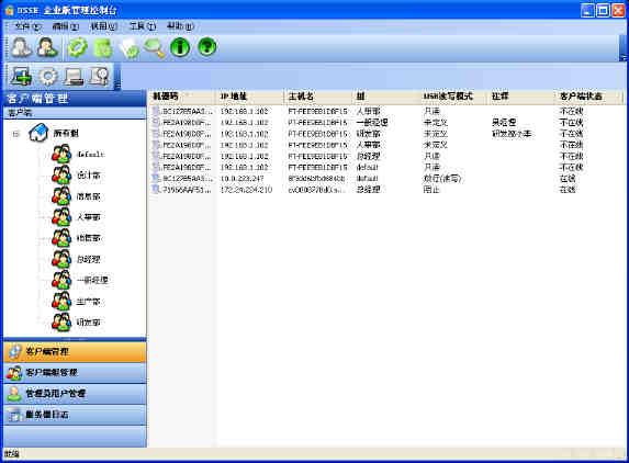 现在公司一般对USB端口的控制比较看重,作为网管也经常为这些屁事烦心阿!老板老是说,一定要把USB端口控制好,不要让员工轻易地将公司的技术资料、文件给拷出去!一直都很烦心,前不久公司有员工辞职就将公司的一些客户资料带走了,老板很是恼火阿!我也没辙阿,老板后来让我到网站上去找找有没有控制USB端口的软件,后来我发现了一款比较好的软件,它就是USB安全存储专家。先前也找过几家,可惜那些软件只能阻止,以后就是真正想拷东西的时候也没有办法,而这款软件有只读、放行、写标识...一系列不错的功能,尤其是它的只读功能特别牛B,它让你的移动硬盘只读就只能只读,哇咔咔这个功能很不错哦,强烈推荐!!!!所以我就下载试用了一下,发现确实很不错。它们这款软件分为专业版和企业版,如果公司不大的话,就选用专业版不错,主要是价格比较便宜80元/套,而企业版就相对要贵点,不过公司大的用企业版比较方便,因为它这款企业版的软件分为服务器、客户端和控制台,网管可以集中控制,一次性安装就可以了。价格好像还可以根据公司客户端的数量跟他谈的,后来我就打电话跟他们联系还买了一套,感觉不错,所以就跟xdjm们共享这个信息,细细!如果有需求的话,可以到他们的公司网站去查看详细的信息阿,http://www.usbsec.net!以后大家如果有什么好的东东,别忘了跟偶分享阿!哇咔咔....