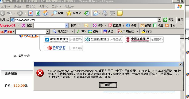 我在IE里输入如www.163.com时会弹出一个如图所示的错误栏,但是点击错误后会正常打开网页.如果在输入任何网址时加上http://时就不会弹出如图所示的错误提示框,请问有高人请指点.我查看了.当前用户是admin.可是这个错误框提示的"networkservice"在