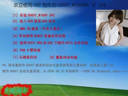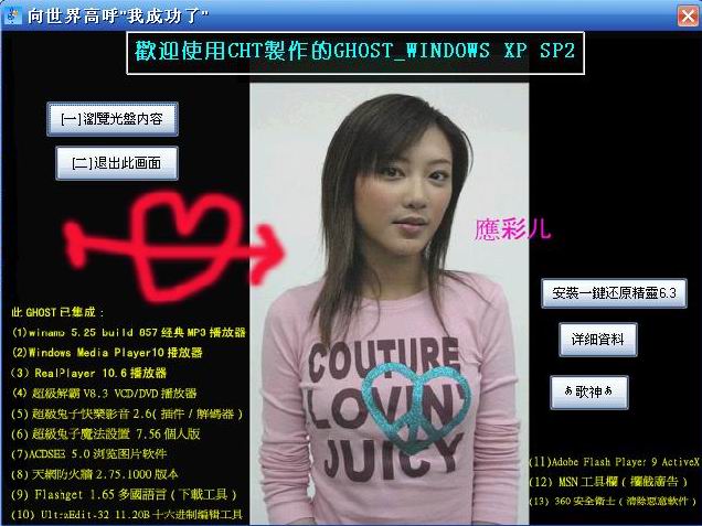 唉 如果我懂得怎么编写就好了。。。那么就能制作出属于自己的个性WINXPSP2——GHOST关盘,然后写上"终生学习"制作等自己喜欢的名字。。 在MM面前炫耀炫耀。。
