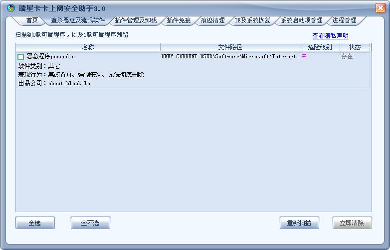 IE7+卡卡3.0.0.11扫描老有恶意程序paraudio,清除以后,再检查又出来了!如果将首页修改,不采用空白页就没有了。估计是卡卡的小问题,希望能修改。