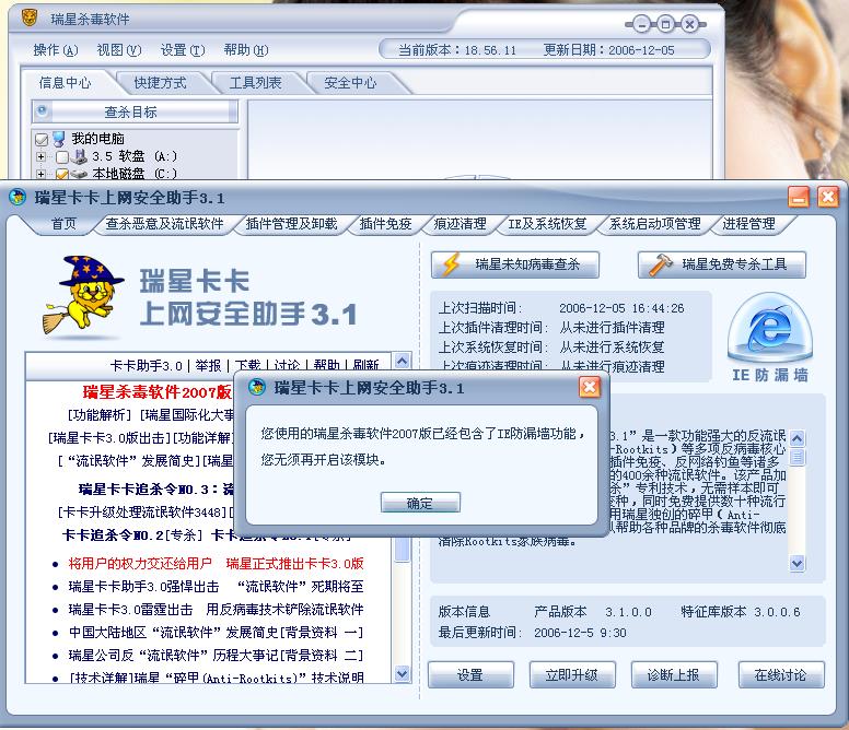 我的瑞星今天只能升级到18.56.11,可是升级到3.1版的卡卡安全助手却在我开户IE防漏墙时,告诉我使用的已经是2007版的杀毒软件了,谁知道是为什么呀?