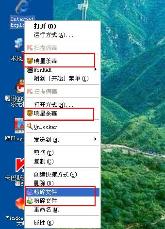 问题一、在桌面上的图标点右键,出现图一的情况,有两个"瑞星杀毒",和两个"粉碎文件"