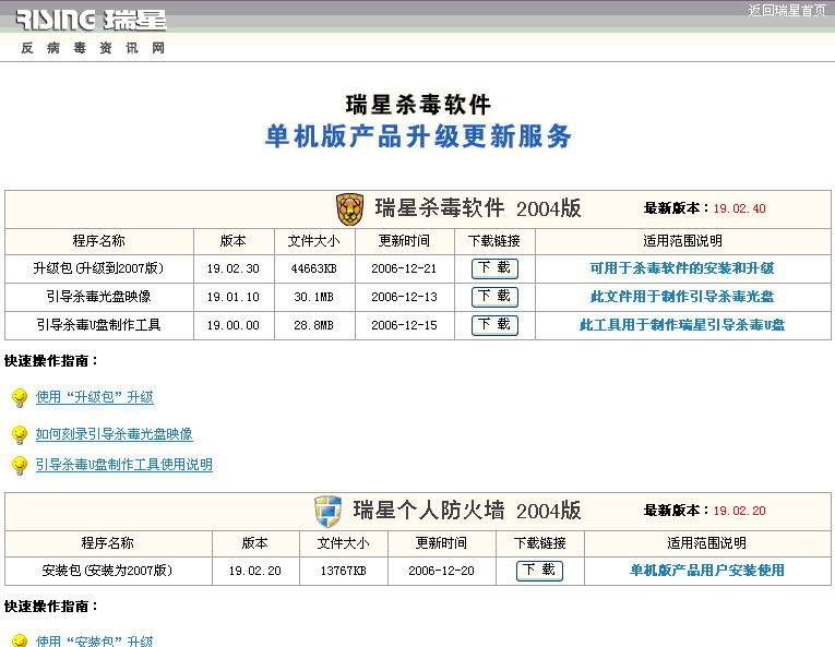 由于您所使用的瑞星杀毒软件版本较早,请您访问瑞星网站并进入【瑞星产品升级更新服务页面】,请将“安装包”与“升级包”均下载到您的计算机中保存起来备用,下载完成后,请首先运行“安装包”进行瑞星杀毒软件的安装(安装前请首先卸载计算机中已经安装的瑞星杀毒软件),瑞星杀毒软件安装完毕后您可以运行“升级包”用于将瑞星杀毒软件升级到最新版本。或点击瑞星杀毒软件主界面中的“升级”按钮以进行智能升级到最新版本。