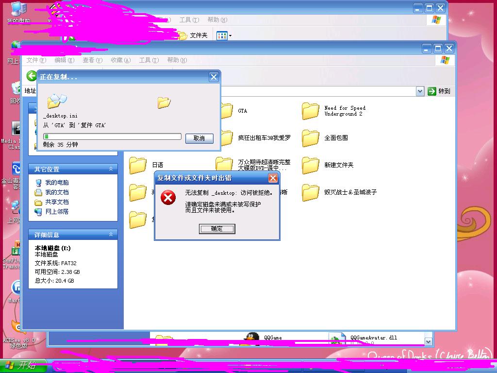 不知怎么回事,最近我的电脑无法正常复制剪切目录文件。一个个的复制文件或复制多个文件是正常的,可是当我想复制多个目录,或者目录下面还有目录和文件时,就会有如下的提示,真是烦死了,请各位朋友帮个忙,看看到底是怎么回事啊。