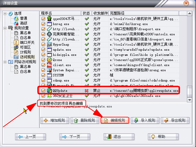 打开→瑞星防火墙→详细设置→访问规则→找到所须被禁止的项目进行编辑设置为允许即可参见下图型红框所示→