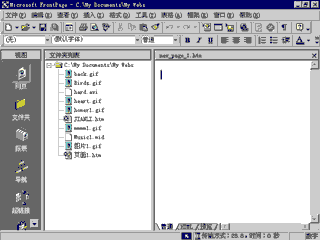 现在进入FRONTPAGE。单击任务栏“开始”按钮,选择“程序”选项,单击“MICROSOFT FRONTPAGE”选项就可以了。 可能你会发现PRONTPAGE界面和WORD很相似[图一],这是因为编辑WEB页面和编辑WORD文档有很多同样的设置,这些设置所用的图标和WORD中的是一样的。