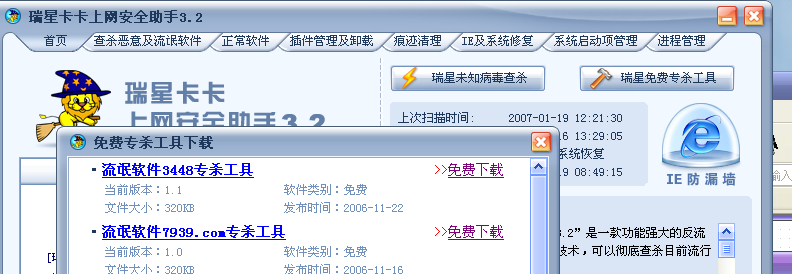安全助手3.2里面点击瑞星免费专杀工具后,出现病毒专杀工具的下载链接,其中流氓软件3448专杀工具下载后是 tfek.exe 该文件被VirusScan识别为特洛伊