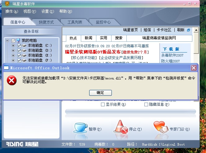 我以前安装了卡巴斯基网络版的杀毒软件,目录为D:\安装文件夹\卡巴斯基,过了一段时间我觉得不好用,就卸载了,但是现在我买的瑞星杀毒软件杀毒的时候突然跳出“无法安装或加载项”D:\安装文件夹\卡巴斯基\mcou.dll,用帮助菜单下的检测并修复的命令可解决此问题