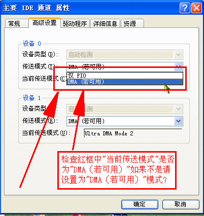 请检查一下系统里的有关设置是否有问题?用鼠标指到“我的电脑”击右键选择“管理”→“设备管理”→“IDE ATA/ATAPI控制器”→“属性”→参见下图片红色框中所示→