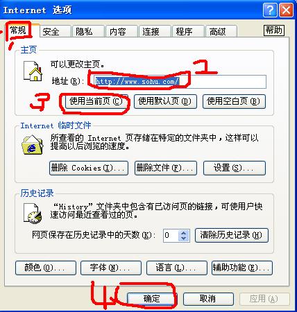 解决办法是:上网--工具--INTERNET选项,左键确认,在下图依次完成1、2、4步骤即可(第1、4是点左键,第2是输入你要的主页地址)!