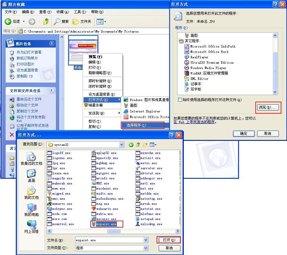 右键--打开方式--选择程序---浏览--指定WINDOWS\SYSTEM32\mspaint.exe