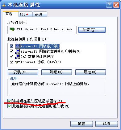 右键-网上邻居-属性-本地连接或者拨号连接-属性-构选“连接后在通知区域显示图标”