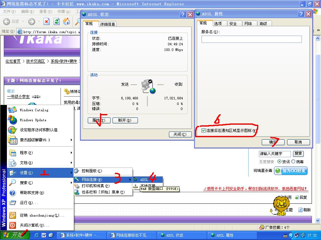 【一年级小学生的贴子】我用的是XP,但在屏幕的右下角,却找不到往常两个显示屏标志的网络连接标志,使我只能通过拔掉网络线来断开接接,请教各位高手如何恢复这个标志的?谢谢!