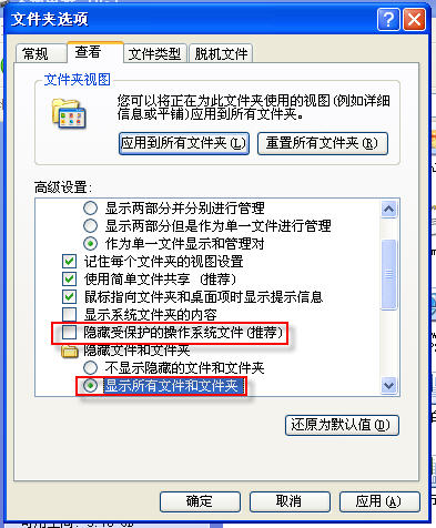“工具”/文件夹选项/查看/去掉“隐藏受保护的操作系统文件”前面的对号,同时选择“显示所有文件和文件夹”
