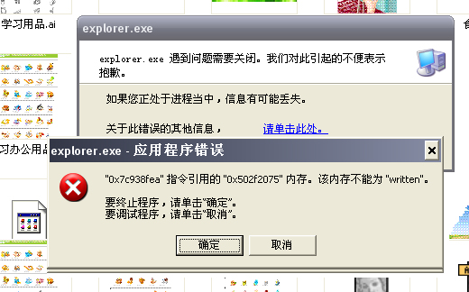 我有时一打开[我的电脑]里的某个文件夹就也出现[0x7c938fea指令引用的0x502f2075内存。该内存不能为written]这个问题。。。。如图