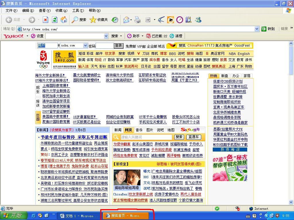 症状:启动WORD2003后,再启动IE,IE窗口可以打开,但对应的任务栏为桔红色,且被认为不是当前窗口,这一点可以从IE窗口的标题栏(正常不应该为虚蓝色而应该为纯正的蓝色)和任务栏的状态(当前窗口的任务栏状态应为凹陷的而不是凸起的)加以证实,如图1所示:
