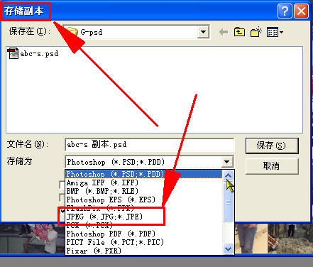 问题同题,我做了一张照片,可是在保存为psd文件后,再想另存为jpg就不行了,以下图是另存为下拉框,就是没有jpg格式,请问我该怎么办才能用photoshop转换成jpg格式呢?