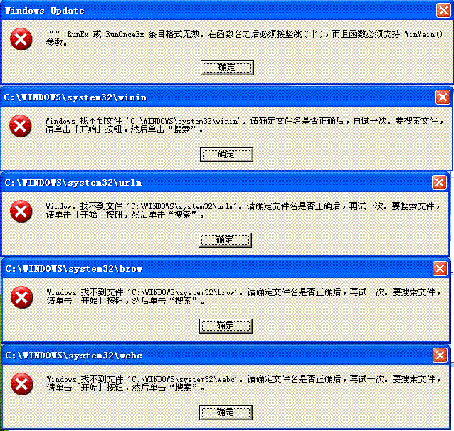 第二个到最后的一个对话框的解决方法:在“开始”→“运行”→输入“REGEDIT”回车,打开注册表编辑器再按F3键,在搜索项里输入弹出的对话框的“文件名”的绝对路径及文件名或它相对应的程序名及它相关的项目再删除即可,当搜索至删除完毕即可,再在“开始菜单”→“运行”→输入“msconfig”回车→进入“系统配置实用程序”→击“启动”卡找到它有关的项目去它掉的钩选项即可。(在修改注册表之前要先关闭瑞星所有监控完成之后再打开它)