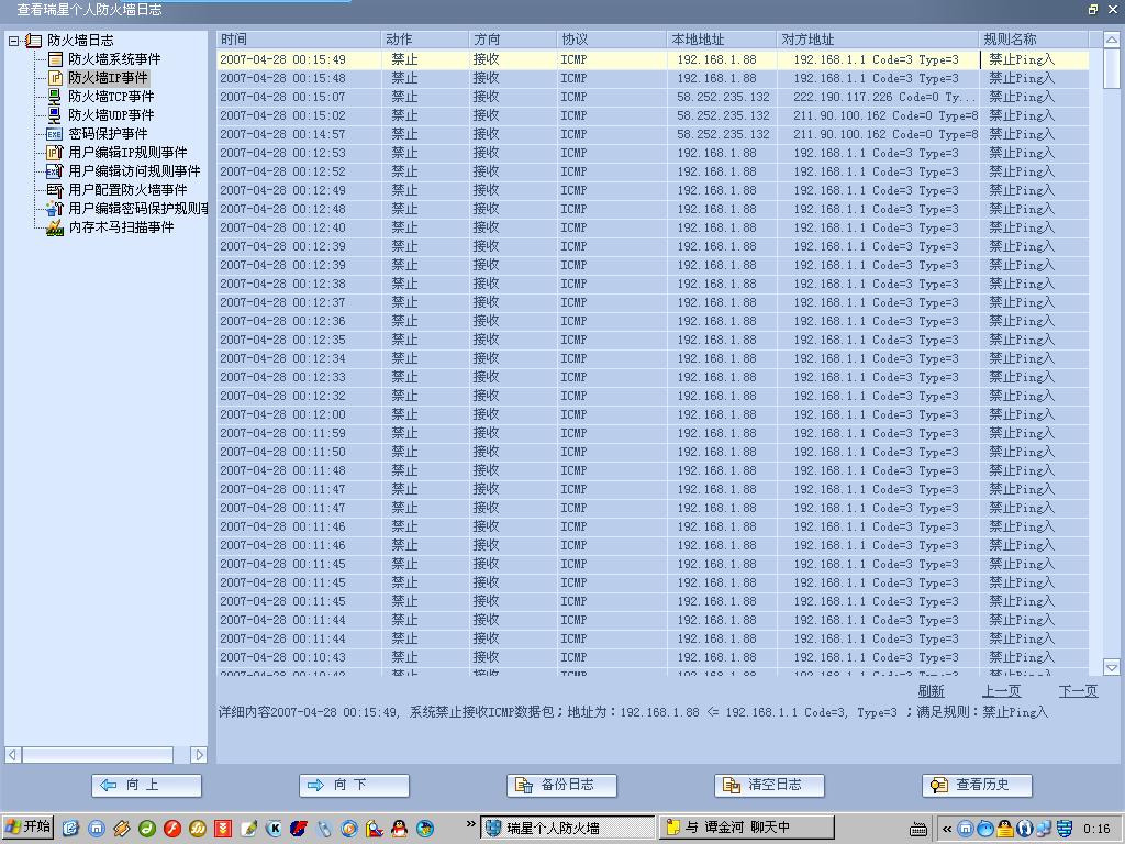 我用的是网通的ADSL宽带,为何瑞星防火墙老是显示有外网IP进行ping命令,还有ADSL猫带路由功能,怎么也会不断发出ping命令,大家请看截图,请大家帮忙!谁知道的请说说……