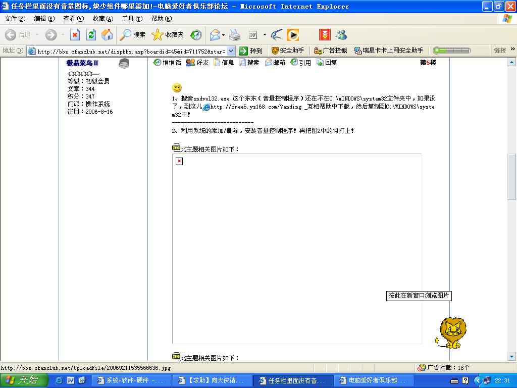 1、搜索sndvol32.exe 这个东东(音量控制程序)还在不在C:\WINDOWS\system32文件夹中,如果没了,到这儿http://free5.ys168.com/?anding _互相帮助中下载,然后复制到C:\WINDOWS\system32中!