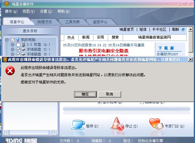 我的瑞星升级后,每次一点击查毒就会弹出“此程序出现致命错误,导致非法推出...”对话框,卸载重装后还会出现这个问题,修复也无法解决。请各位大侠指点一下!