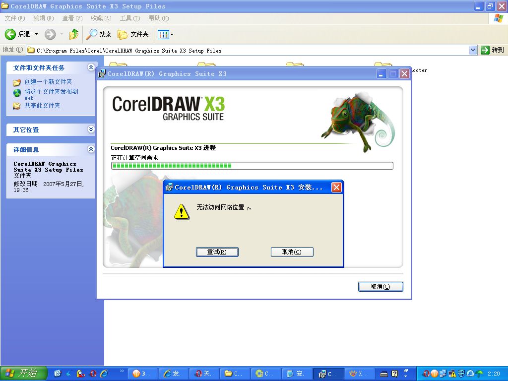 我新装设计排版软件CorelDRAW X3总是不成功,每次都是出现这种问题——提示“无法访问网络位置\”