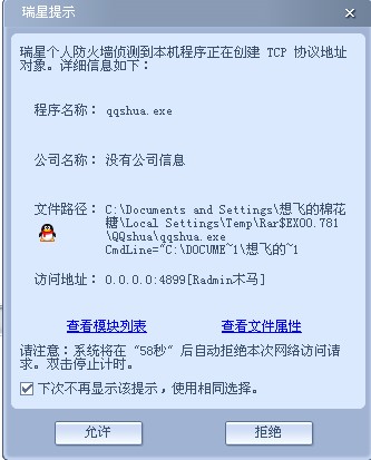 我从一个人那里购买了一个和QQ有关的软件。我双击之后有连接网络的提醒,我没看就同意了,可是这个软件并没用运行。但是在工具栏最左侧时间那里有个空白的位置,我想应该就是说那个程序被打开了,可是没有反应。我重起再试,这是出来了提醒。我看上面说的路径和我保存文件的路径完全不一样!我找不到那个路径。而且还说什莫木马。请大家帮我看一下。如果这是个木马,我怎莫做呢?查毒什莫的都查不到。怎莫消除呢?谢谢!