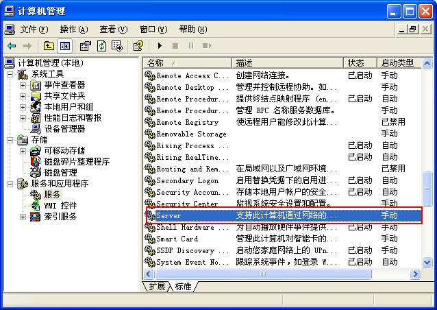 我的电脑--右键--管理--服务和应用程序--服务---找到Server 停止这项服务,然后设置为手动。
