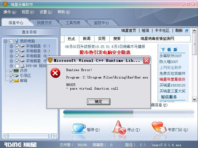我已经是卸载后再安装的了,就出现了第二个图的问题,不止如此,我单独查这个出问题的nero所在的文件夹时,虽能查完可当我已按确定就会跳出rav应用程序错误,内存不能read什么的,可我单独查那个pcmark所在的文件夹时就没事
