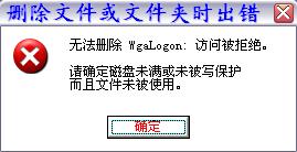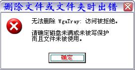 结束进程我试了 WgaTray.exe的这个进程我一结束 它自己就又蹦出来了 而删除文件的时候 系统会告诉我说“请确定磁盘未满或未被写保护 而且文件未被使用”(如图) 至于您说的Autorun删掉启动项 这个怎么玩啊?