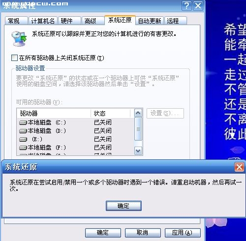 你将所有硬盘的系统还原都设置为“已关闭”,肯定用不了系统还原啦,至少应该有一个是“监视”状态。