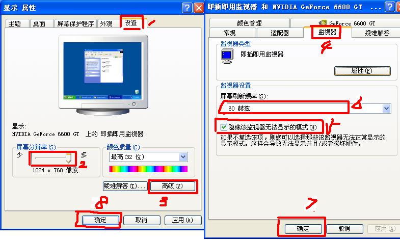 重装正常的显卡驱动(最好用显卡自带的驱动光盘),然后再按照我前面的图设置。
