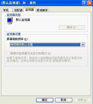 安全模式卸载或显卡驱动,然后进入正常模式等机器自动安装显卡驱动后,屏幕分辨率、刷新率就回到初始值(800*600、60Hz),然后重新设置比这个配置高一点并符合显卡支持范围内的数值就可了(不要在设置黑屏时的数值,要比它低点)。