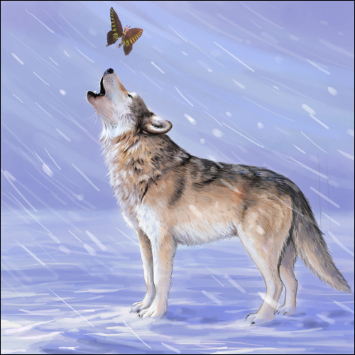 那为大大能帮我把以下的2张图和到一起不要蝴蝶的背景,蝴蝶的大小改的合适点蝴蝶最好在狼的头上,整体背景用狼那张图的背景谢谢了啊!跪求了啊!
