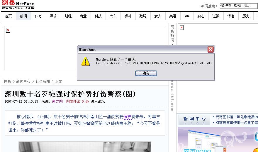 如图,现在打开网易新闻的一些链接,就会出现如图所示的问题,关闭浏览器,起初以为是浏览器的问题,卸载了腾讯tt,换了傲游,还是不行。