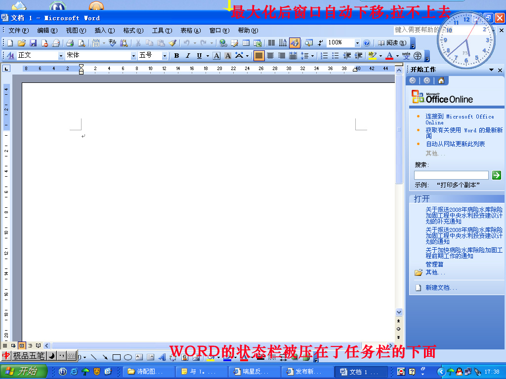 我的WORD这两天出了个怪现象,打开可新建一个文档,最大化窗口后并没有把整个屏幕充满,而是自动整体下移一点,标题栏上方空出一个空区,下边状态栏被WINDOWS的任务栏给压在下面,只有窗口还原后才能看到正常,点着标题栏往上拉也拉不上去,请懂这个的给指点一下,怎么解决.谢谢了,下面是我抓的图.