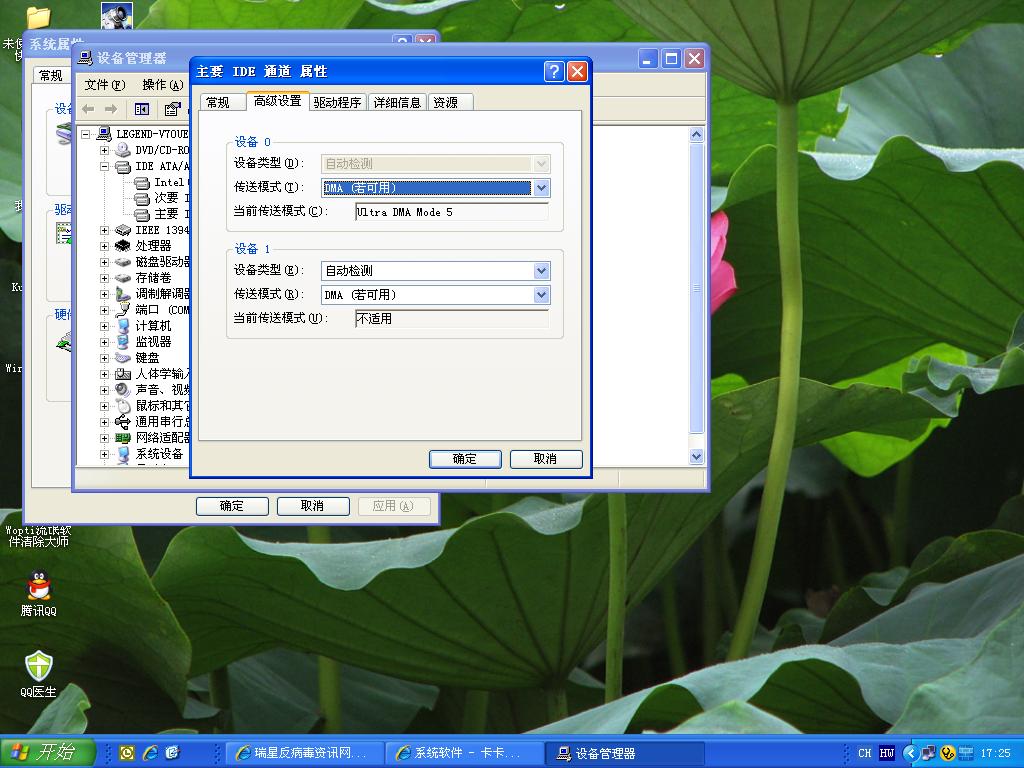 右键我的电脑-属性-硬件-设备管理器,点开IDE ATA/ATAPI控制器,分别右键"主要IDE通道"和"次要IDE通道",选"属性"-"高级设置".