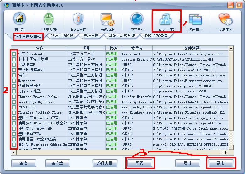 打开卡卡上网安全助手,在步骤2处勾选你要清理的插件,然后根据你的需要,对该插件进行卸载或禁用。