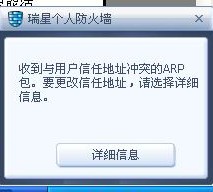 瑞星防火墙老是提示“收到与用户信任地址冲突的ARP包”,怎么回事?