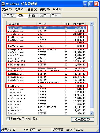 瑞星的进程是比较多,不像卡巴斯基只有两个,瑞星最少5-6个。