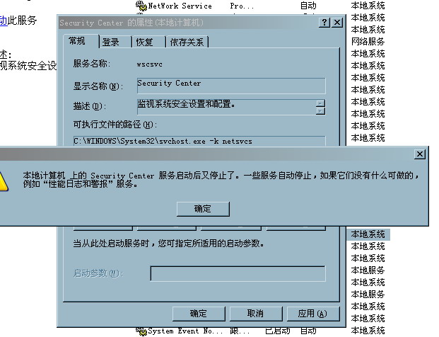 一开里面是自动,但是已经停止了.启动后又停止境了,截个图给大伙看一下,大伙帮我一下,要怎么样才能启动Security Center服务啊