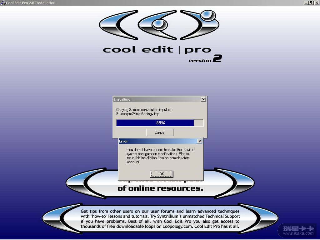 我下载了Cool Edit Pro 2.1安装包,软件安装到89%就出现错误(如图),我不认识英语,点OK以后就关闭了。我又在许多网站下载,结果全部是安装到89%就出现同样的错误,我按照默认路径安装也是一样。我还下载了许多安装方法图解和视频讲座,但是无论如何安装,软件安装到89%就出现错误。我还把注册表中的所有的cool edit pro2有关的进行了删除,重新启动电脑用administrator用户进入(平时使用的不是这个管理员用户)安装,问题依然一样。请教高手指点。