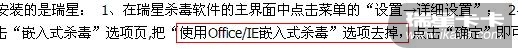 如果l楼主安装的是瑞星: 1、在瑞星杀毒软件的主界面中点击菜单的“设置→详细设置”; 2、在弹出的瑞星设置对话框中点击“嵌入式杀毒”选项页,把“使用Office/IE嵌入式杀毒”选项去掉,点击“确定”即可。 这个可以解决第一个问题