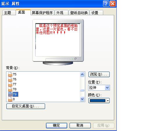 我想更换桌面,但是“显示属性”的“桌面”里的那个预览的电脑没有桌面的图案,全是一片蓝色