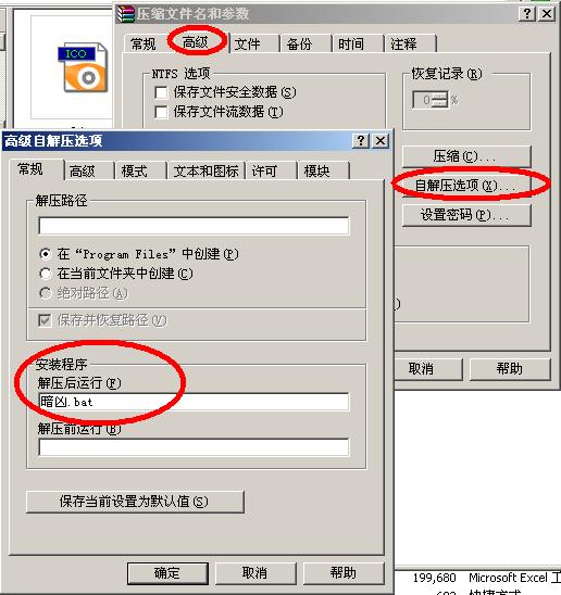 3 高级》自解压选项》常规》安装后运行  连接到 暗凶批处理文件 这里的作用是为了能  压解后自动运行想要运行的文件  运行后自动删除