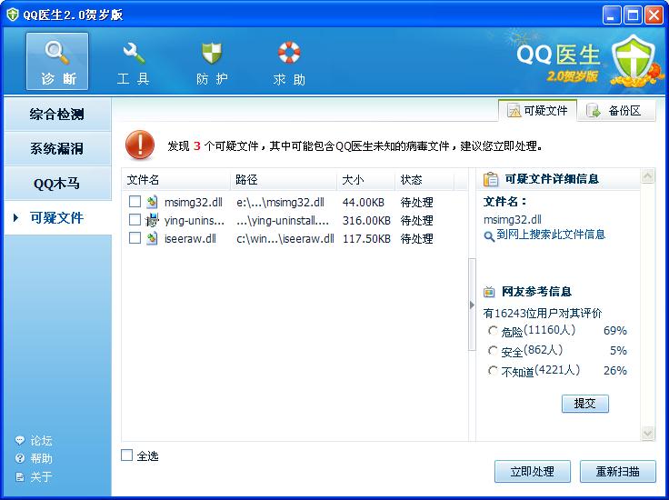 回复:QQ医生扫描出3个可疑文件,该删除吗?