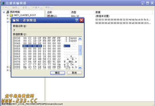 http://www.sysinternals.com/Utilities/PsExec.html (5)定位到HKEY_LOCAL_MACHINE\SAM\SAM\Domains\Account注册表项,双击打开右侧的F键值。