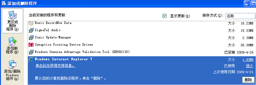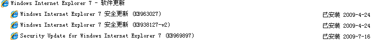 最近IE 7出了点小问题,我打算卸载IE 7后重装,可是来到控制面板——添加或删除程序中,本本上只发现关于IE 7的安全更新,并没有IE 7的程序项(如图),我曾试着重装IE 7再卸载,可是依然在添加或删除程序中只有IE 7的安全更新,并没有程序项(如图),而台式机上却有IE 7的程序项,不知道这是怎么回事?想请教一下:该如何卸载这样没有程序项的IE 7?